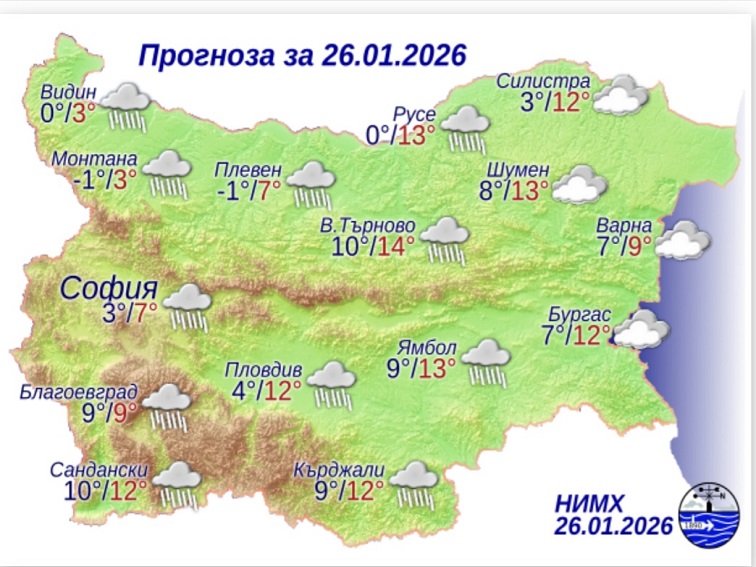 Днес ще бъде облачно. Ще има валежи от дъжд, значителни в Рило-Родопската област. Преди обяд в западната и централната част от Дунавска равнина ще вали предимно слаб дъжд и там ще има условия за поледици. Най-късно, чак вечерта, ще завали и в източните райони от страната. В Източна България и на места по северните склонове на планините ще духа умерен до силен вятър от юг-югоизток. Ще остане топло за края на януари с максимални температури между 9° и 14°, по-ниски в Северозападна България и високите западни полета, в София 6°-7°.